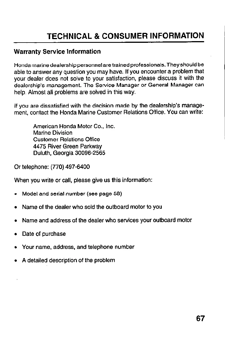 ment, contact the Honda Marine Customer Relations Office. You can write: