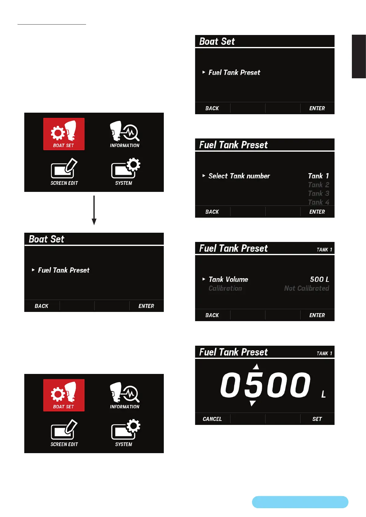 To use the fuel tank setting function, select BOAT SET from the