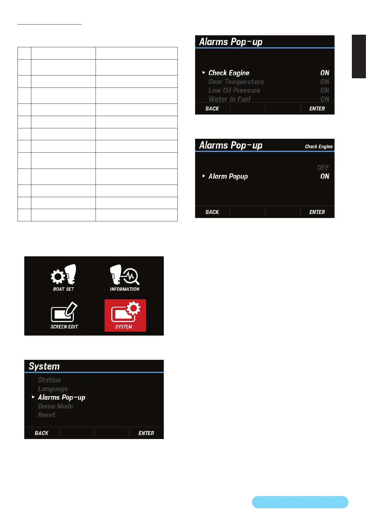 ] button to select Alarms Pop-up and