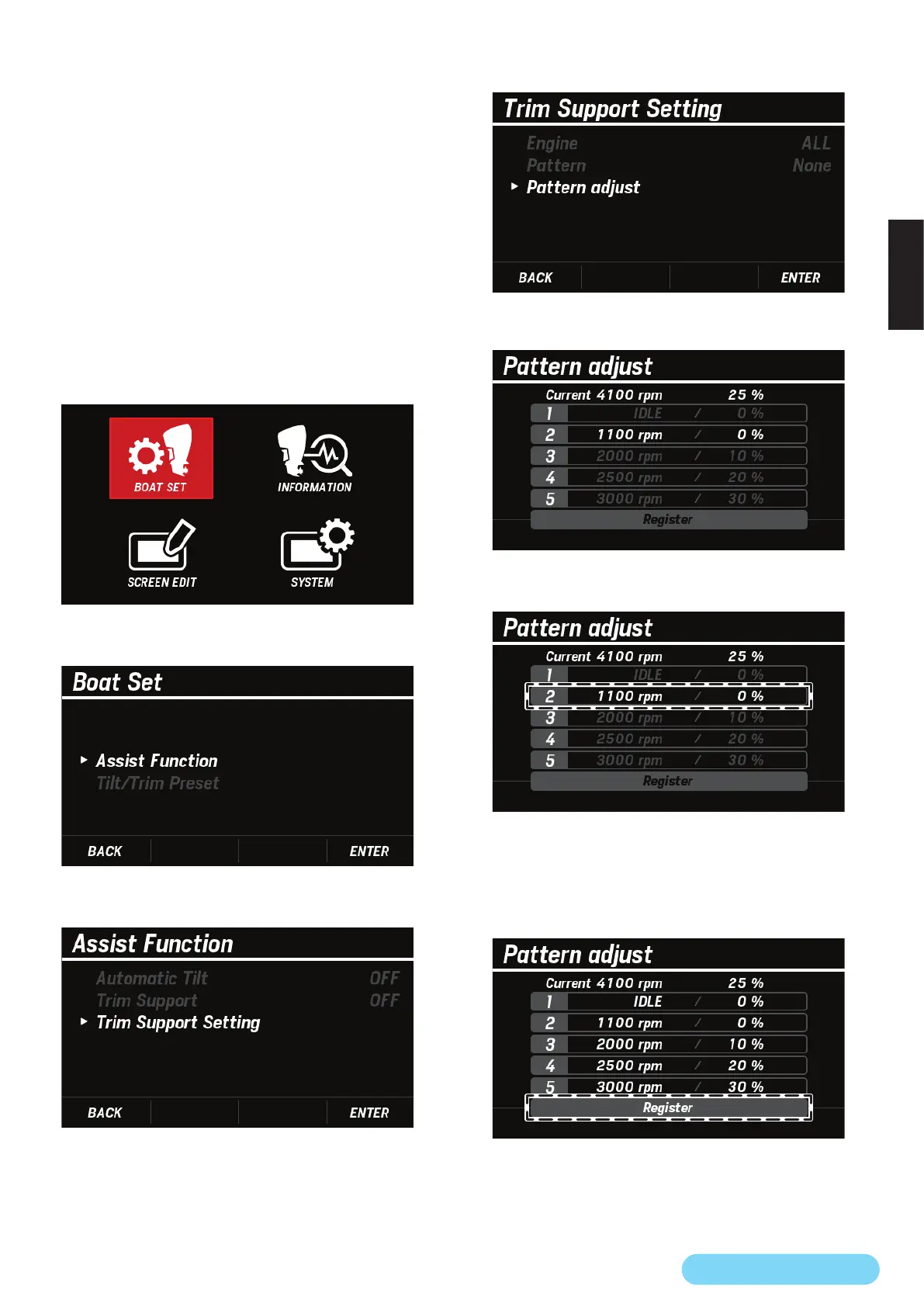 すべての回転数、トリム角を設定後、[∧]/[∨]ボタ