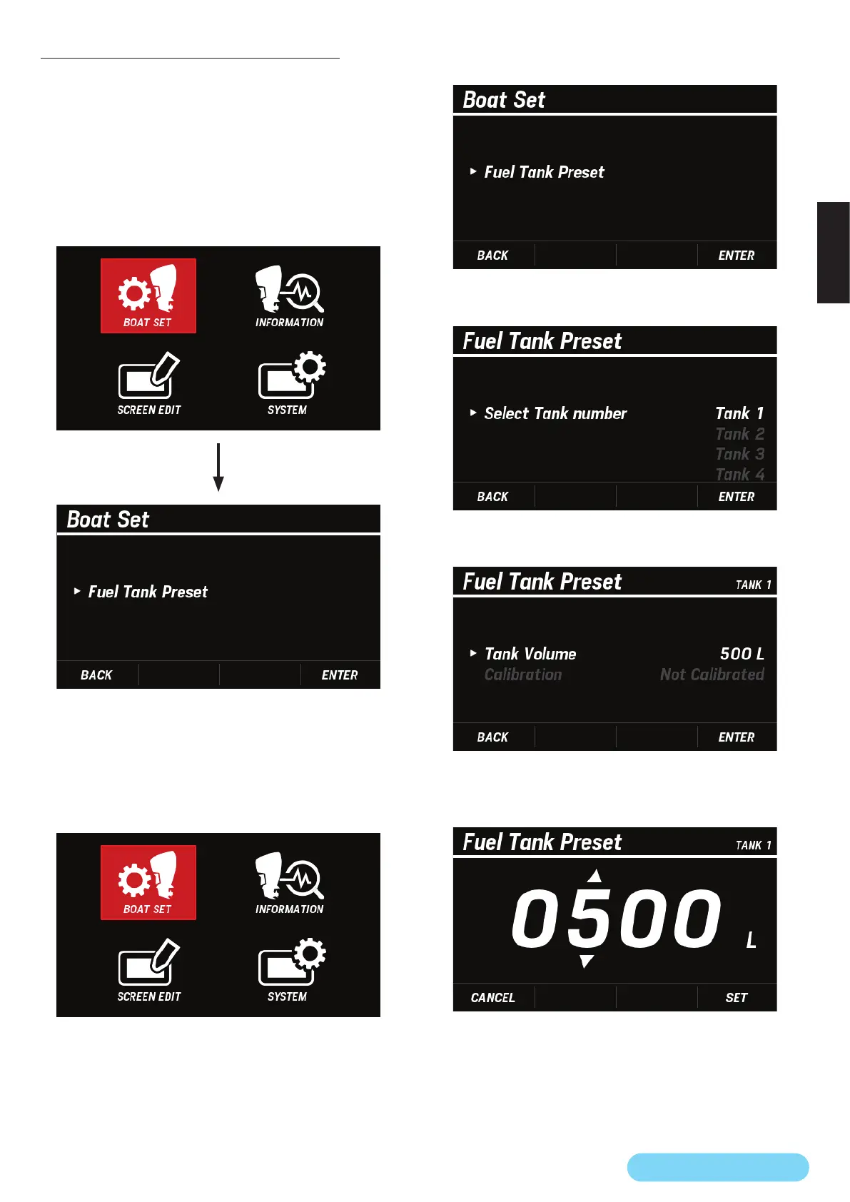 燃料設定機能を使用するためには、MENU 画面の BOAT