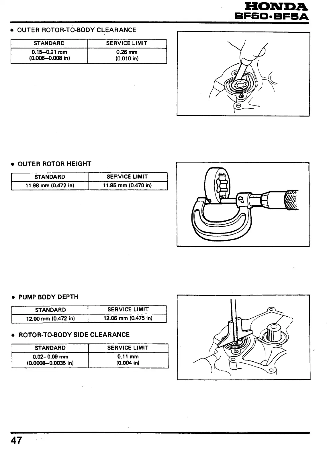 Honda BF50S - Outer Rotor-To-Body Clearance; Outer Rotor Height; Pump Body Depth; Rotor-To-Body Side Clearance