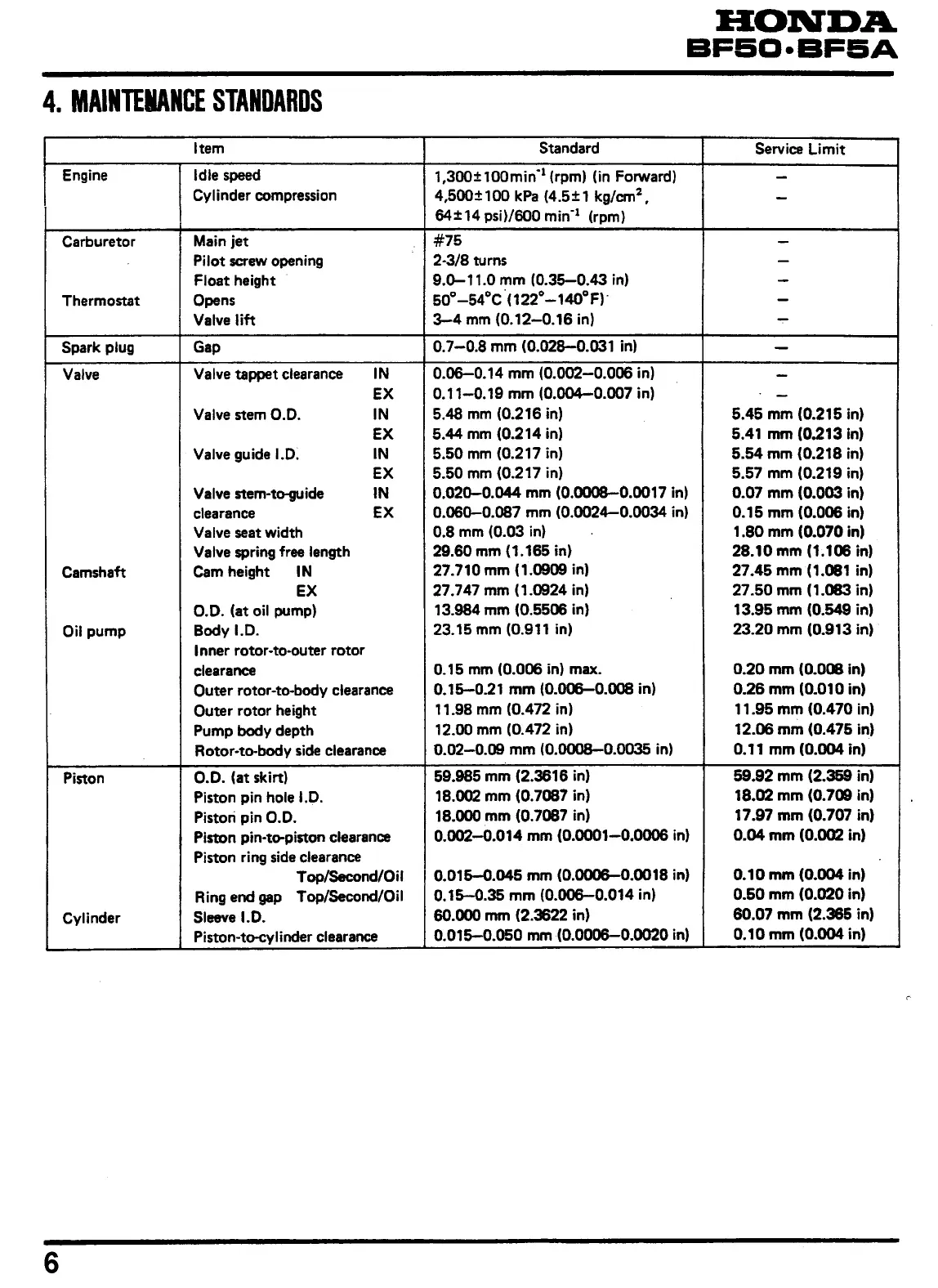 Honda BF50S - Maintenance Standards