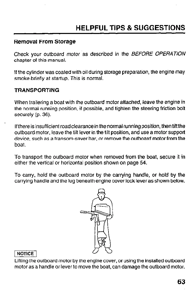 To carry, hold the outboard motor by the carrying handle, or hold by the