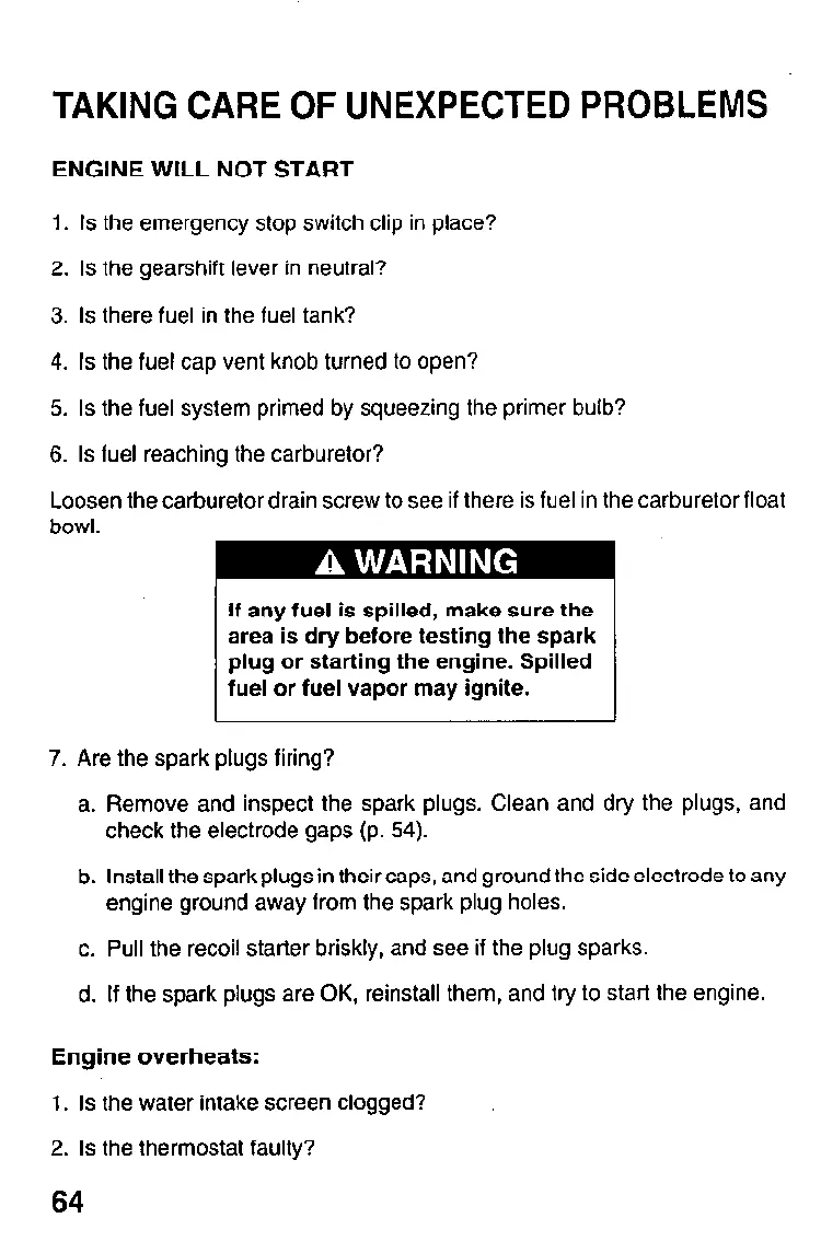 d. If the spark plugs are OK, reinstall them, and try to start the engine.