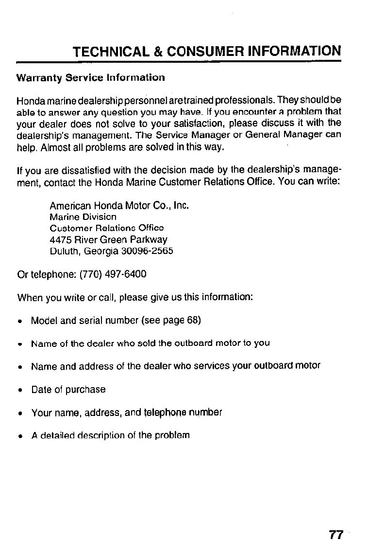 ment, contact the Honda Marine Customer Relations Office. You can write:
