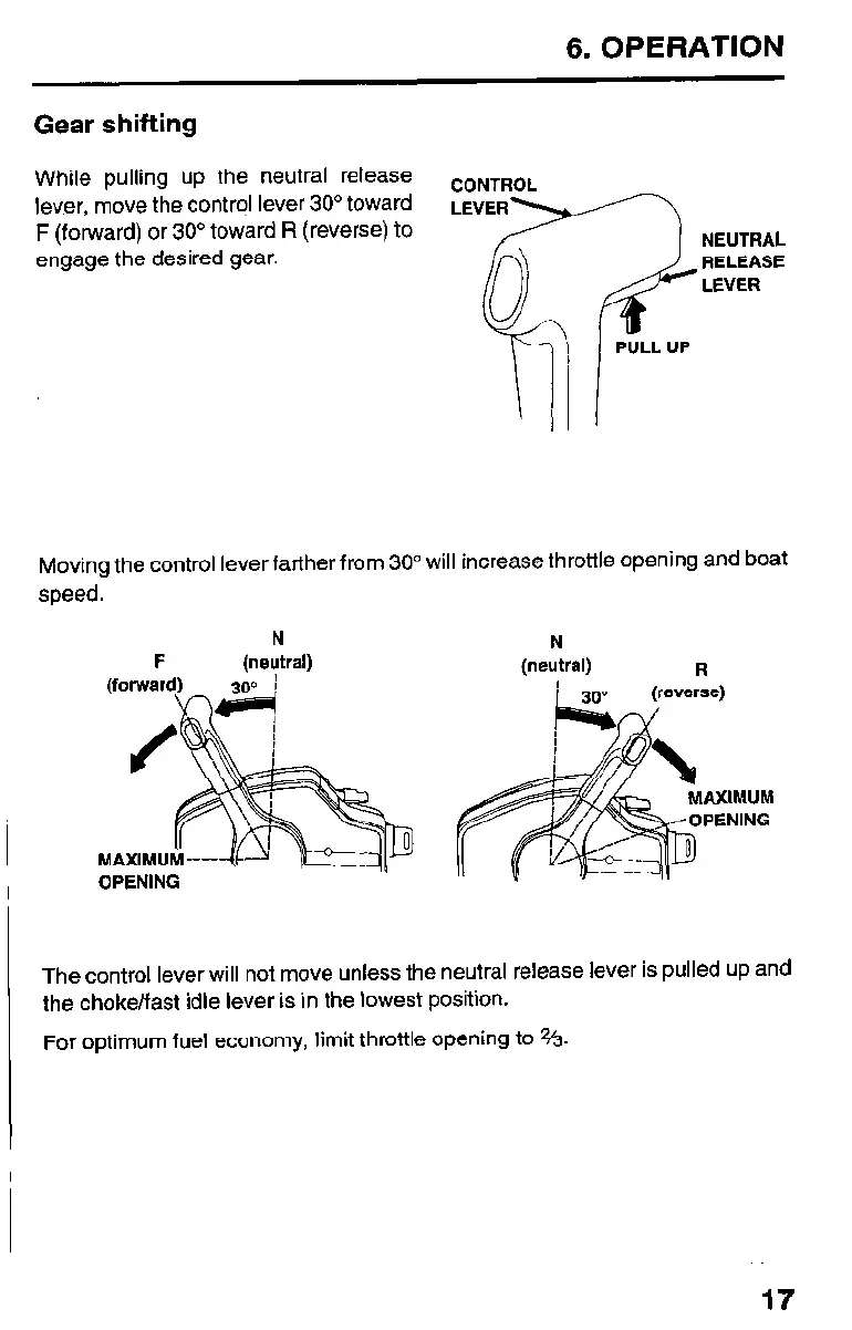 Moving the control lever farther from 30” will increase throttle opening and boat