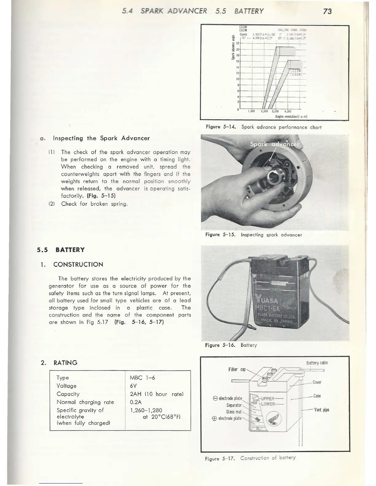 Honda C50 - Battery View; Battery Construction; Inspecting the Spark Advancer; Spark Advance Performance Chart