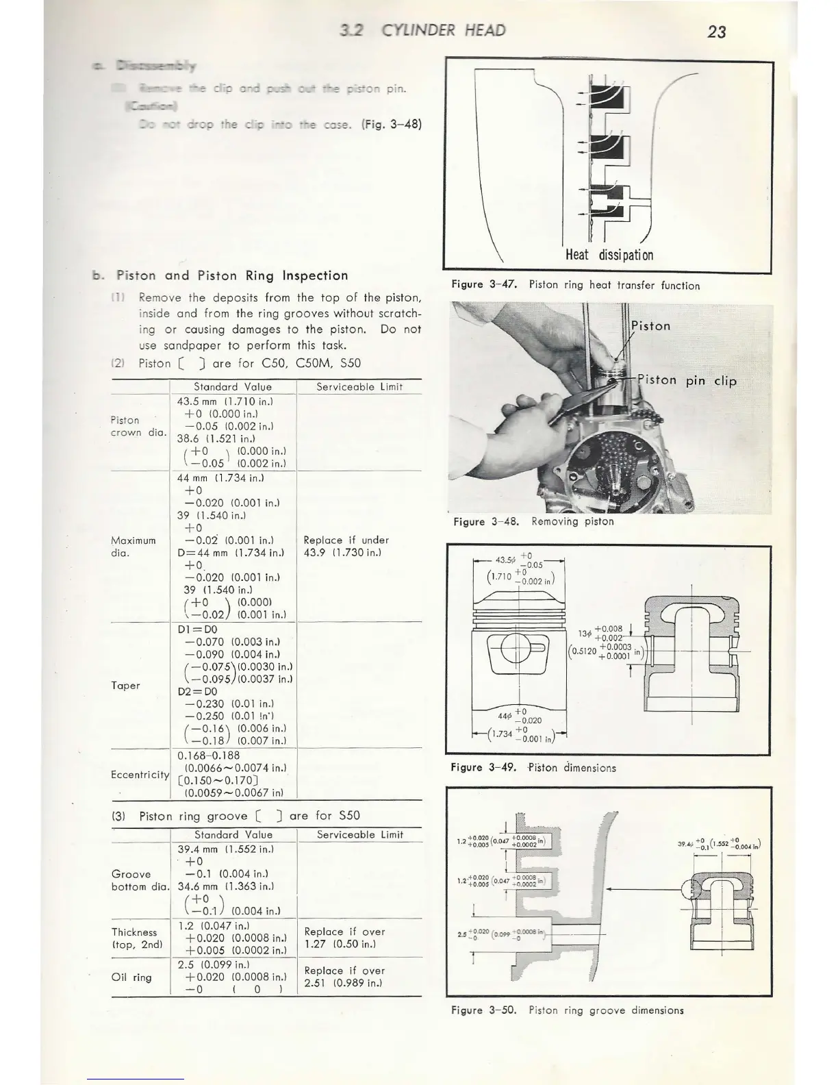 Honda C65 - Piston and Piston Ri Ng Inspection; Piston Dimensions Diagram; Piston Ring Disassembly; Piston Ring Groove Dimensions Diagram