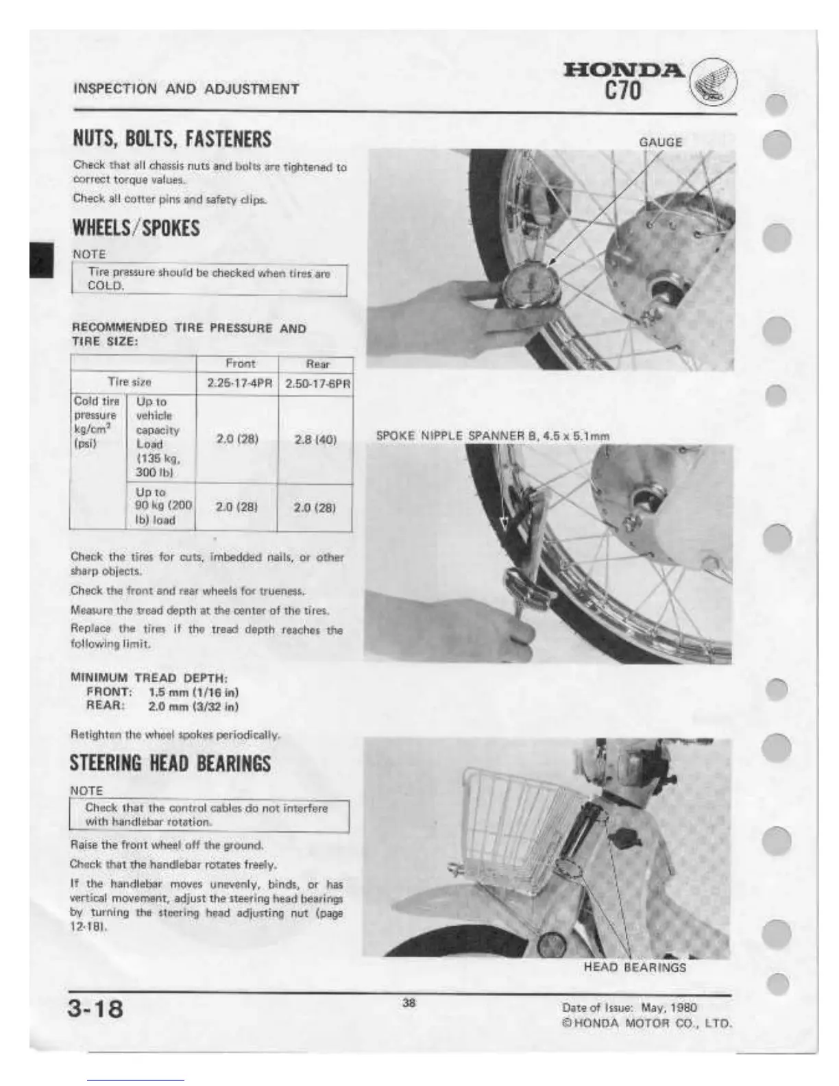 Honda C70 - Nuts, Bolts, Fasteners; Wheels;Spokes; Steering Head Bearings; Recommended Tire Pressure and Tire Size