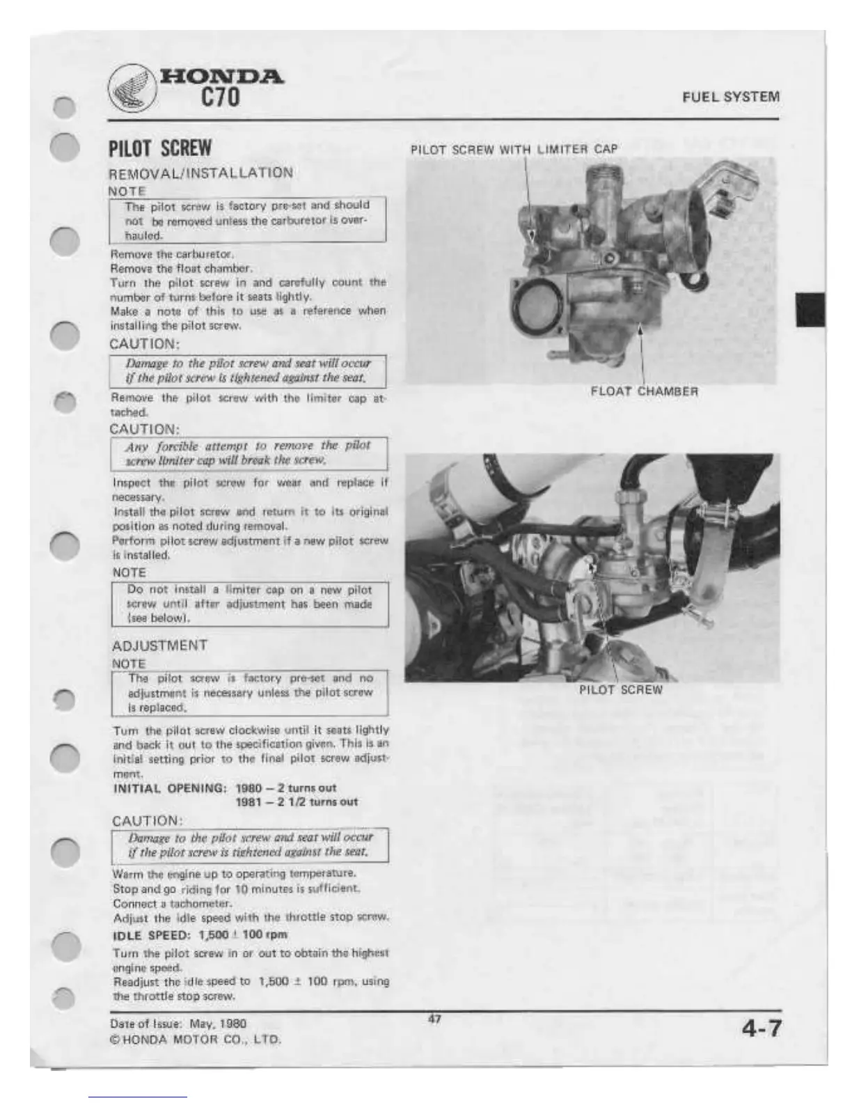 Honda C70 - Pilot Screw Removal;Installation; Pilot Screw Adjustment