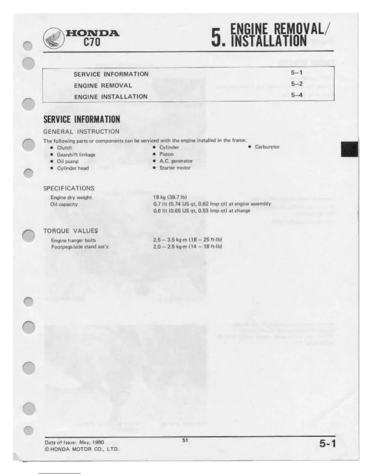 Honda C70 - Engine Removal;Installation Service Information; Engine Removal;Installation Specifications; Engine Removal;Installation Torque Values