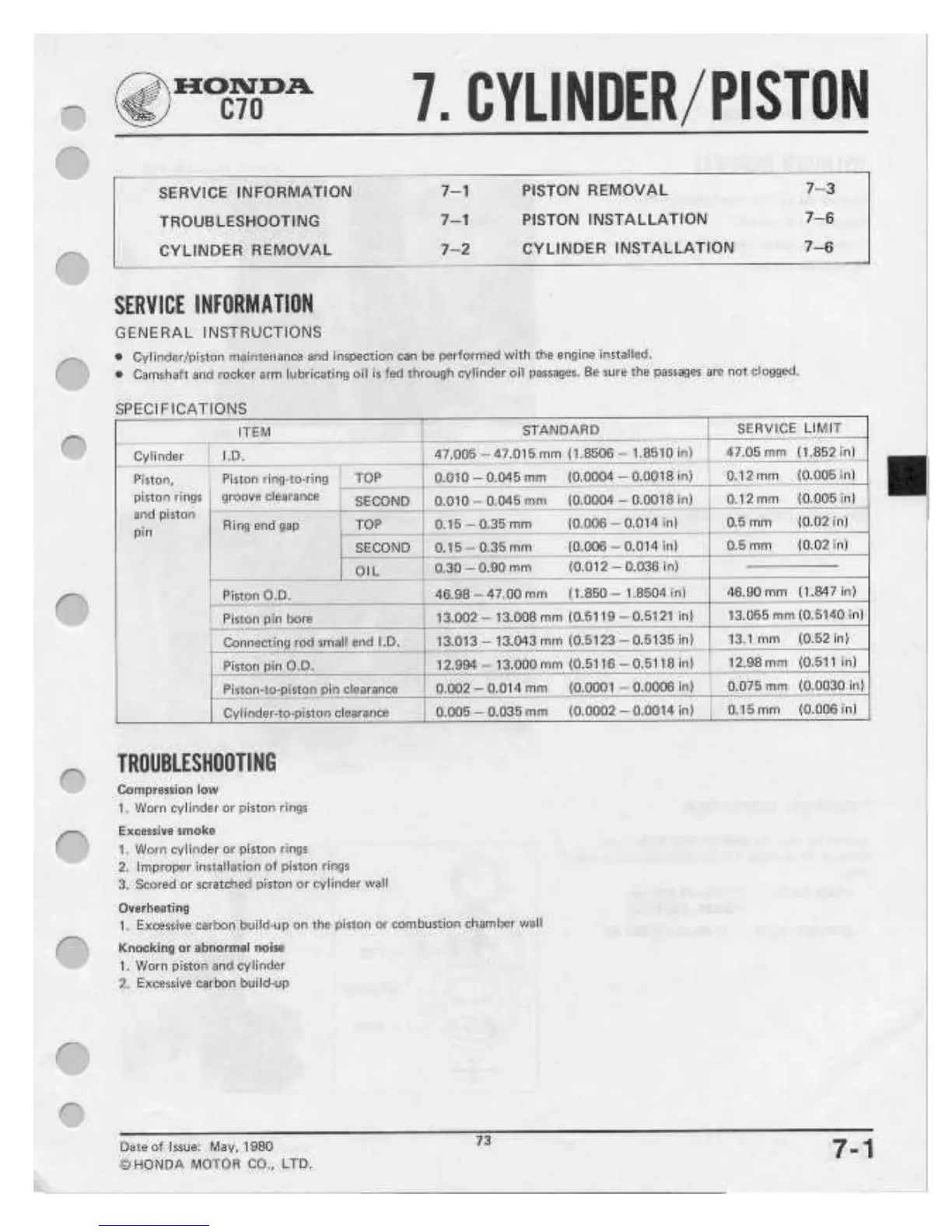 Honda C70 - Cylinder;Piston Service Information; Cylinder;Piston Troubleshooting; Cylinder;Piston Specifications