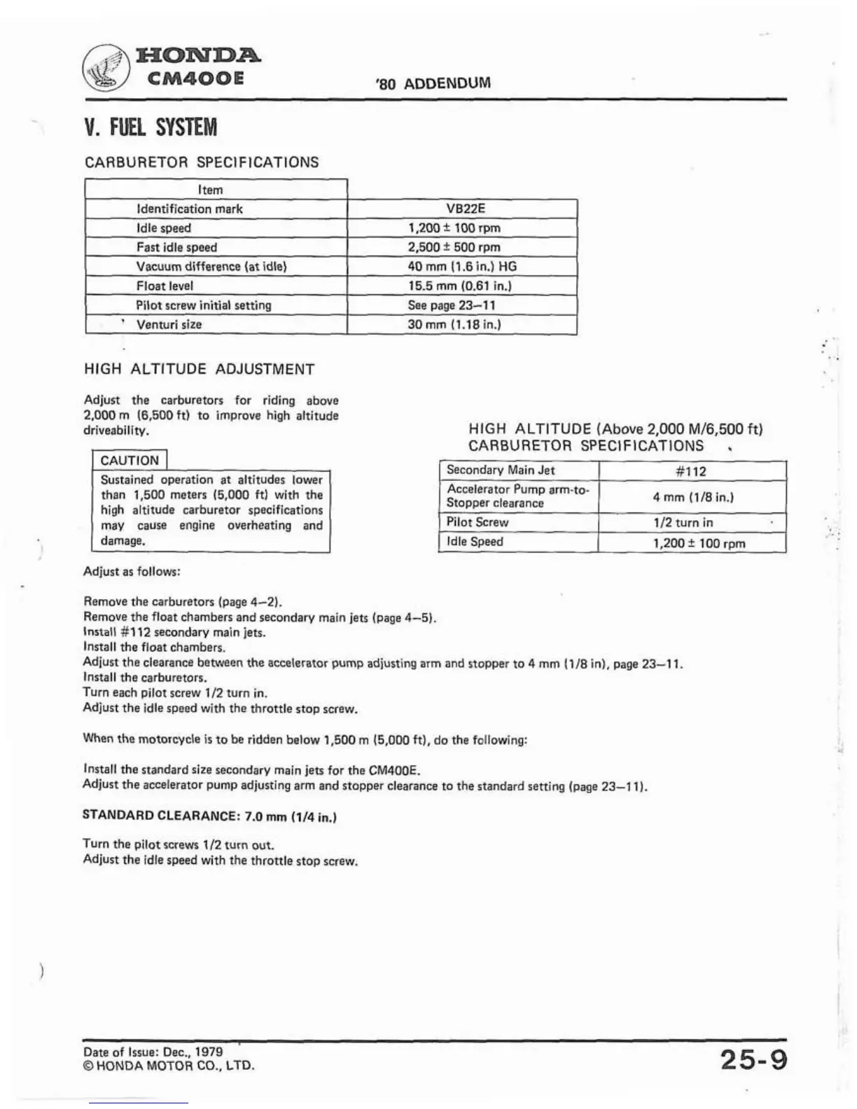 Adjust the accelerator pump adjusting arm and stopper clearance to the standard setting (page 23-1 1).