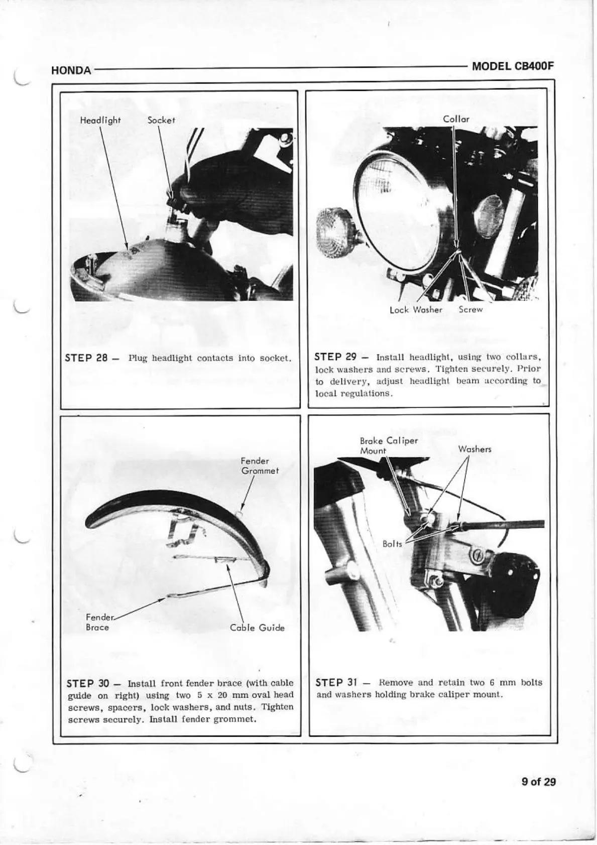 Honda CB400F - Headlight and Fender Brace Installation; Connect and Install Headlight; Install Front Fender Brace