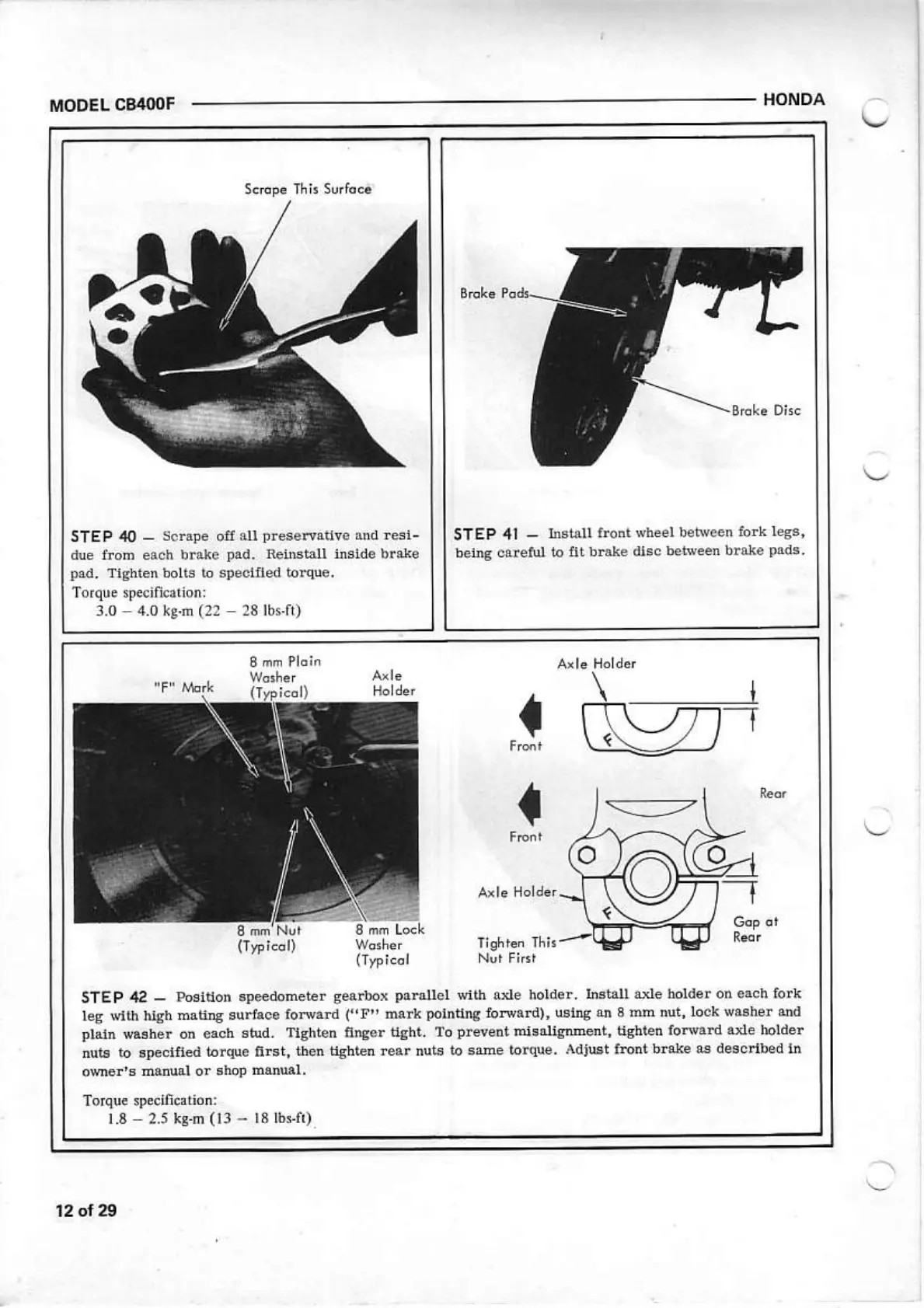 Honda CB400F - Brake Pad Preparation and Wheel Alignment; Prepare Brake Pads; Install Front Wheel and Axle Holders
