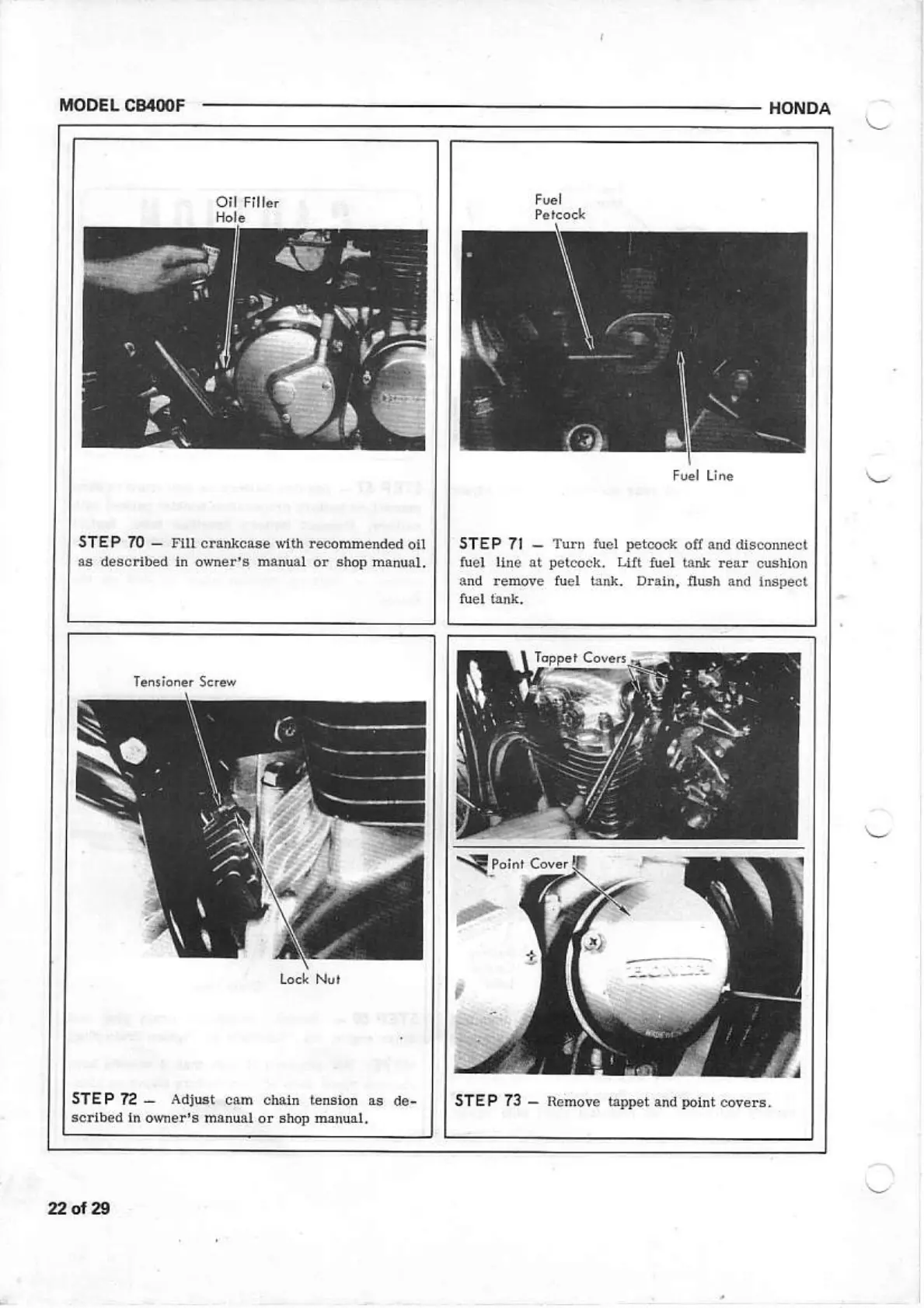 Honda CB400F - Engine Oil, Fuel Tank, and Chain Tension; Fill Crankcase with Oil; Adjust Cam Chain Tension