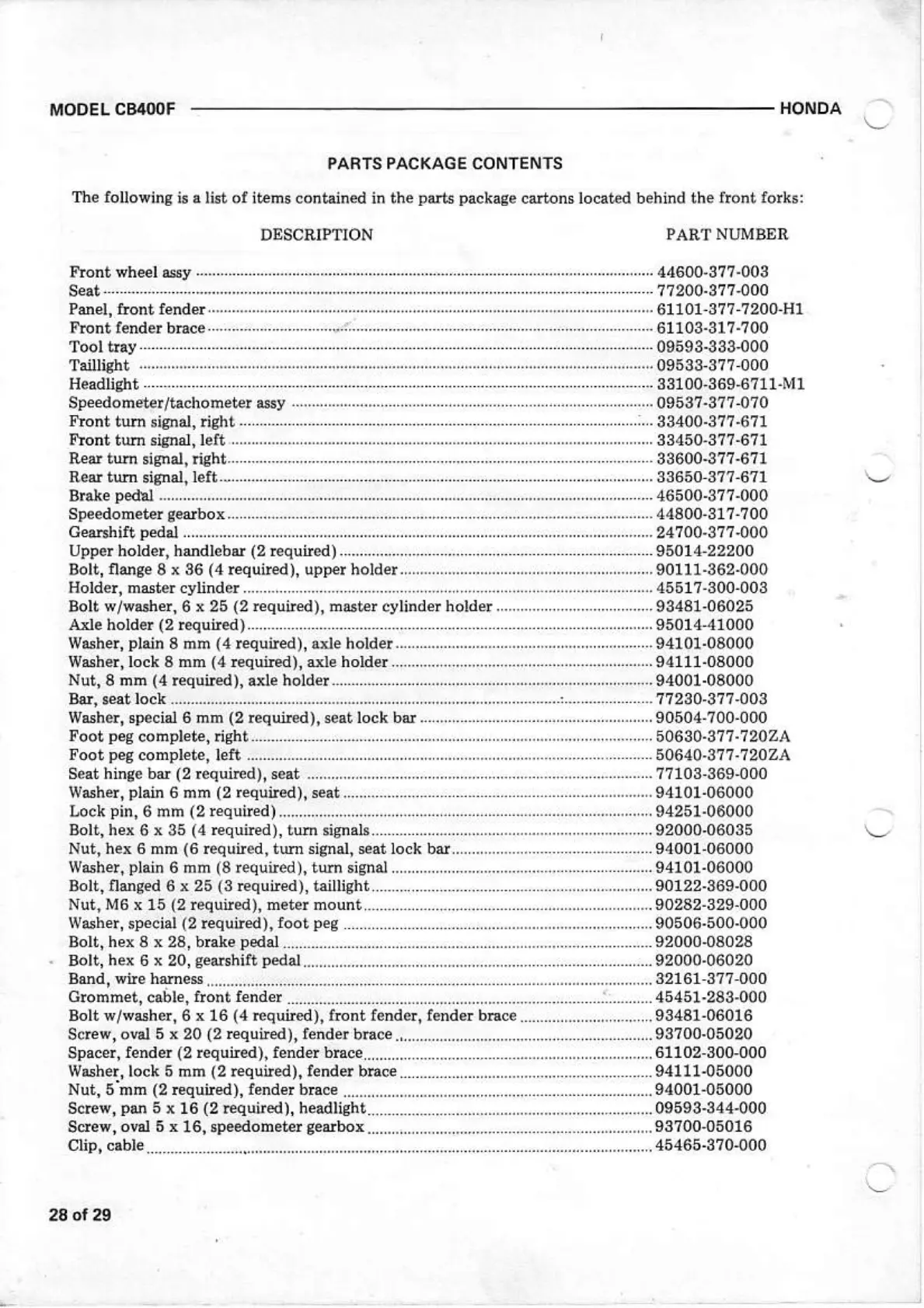 PARTS PACKAGE CONTENTS