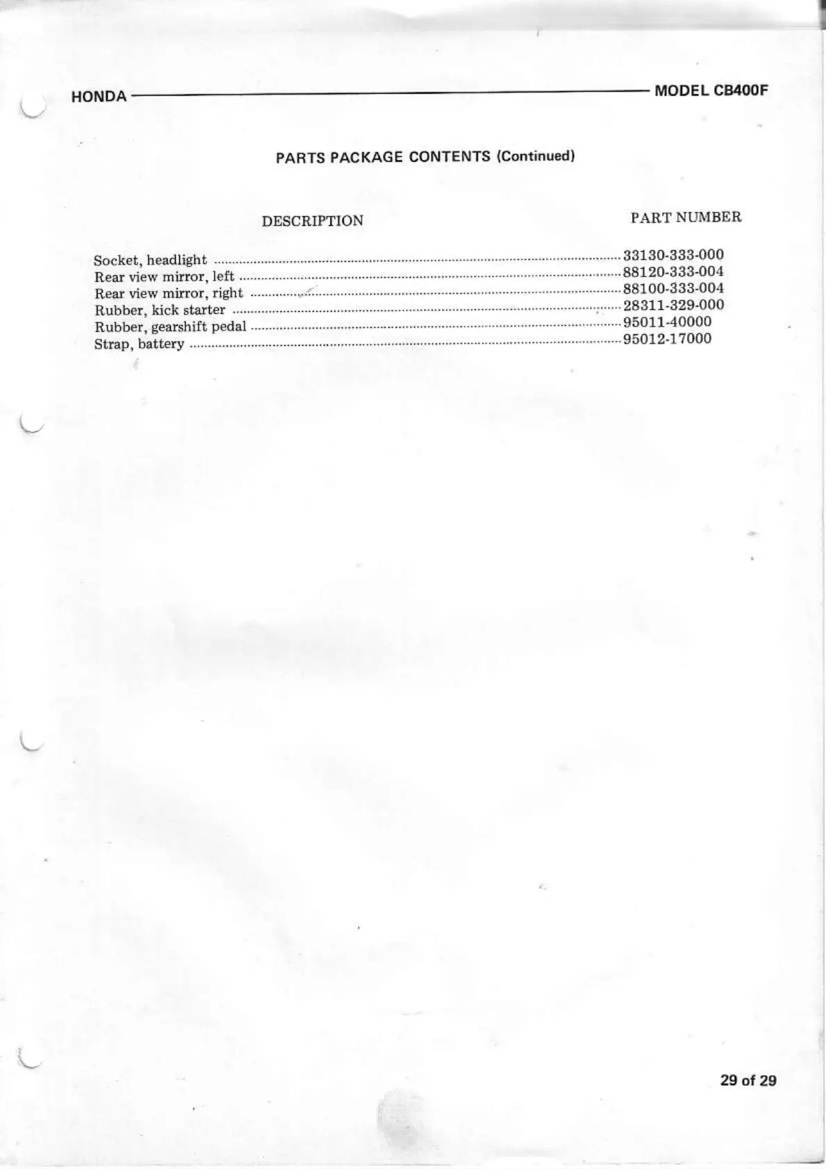 Honda CB400F - Parts Package Contents (Continued); Mirror, Socket, and Rubber Parts