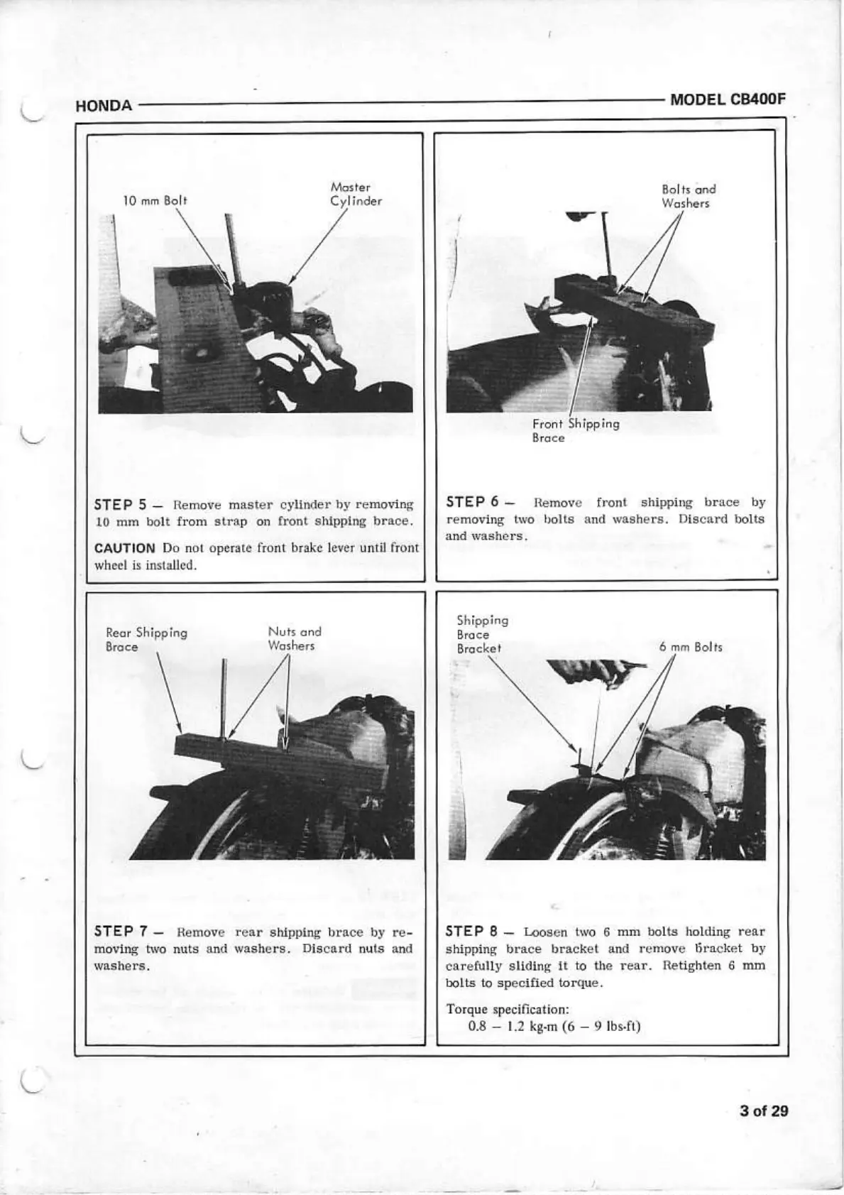 Honda CB400F - Shipping Brace Removal; Master Cylinder and Front Brace Removal; Rear Brace and Bracket Removal