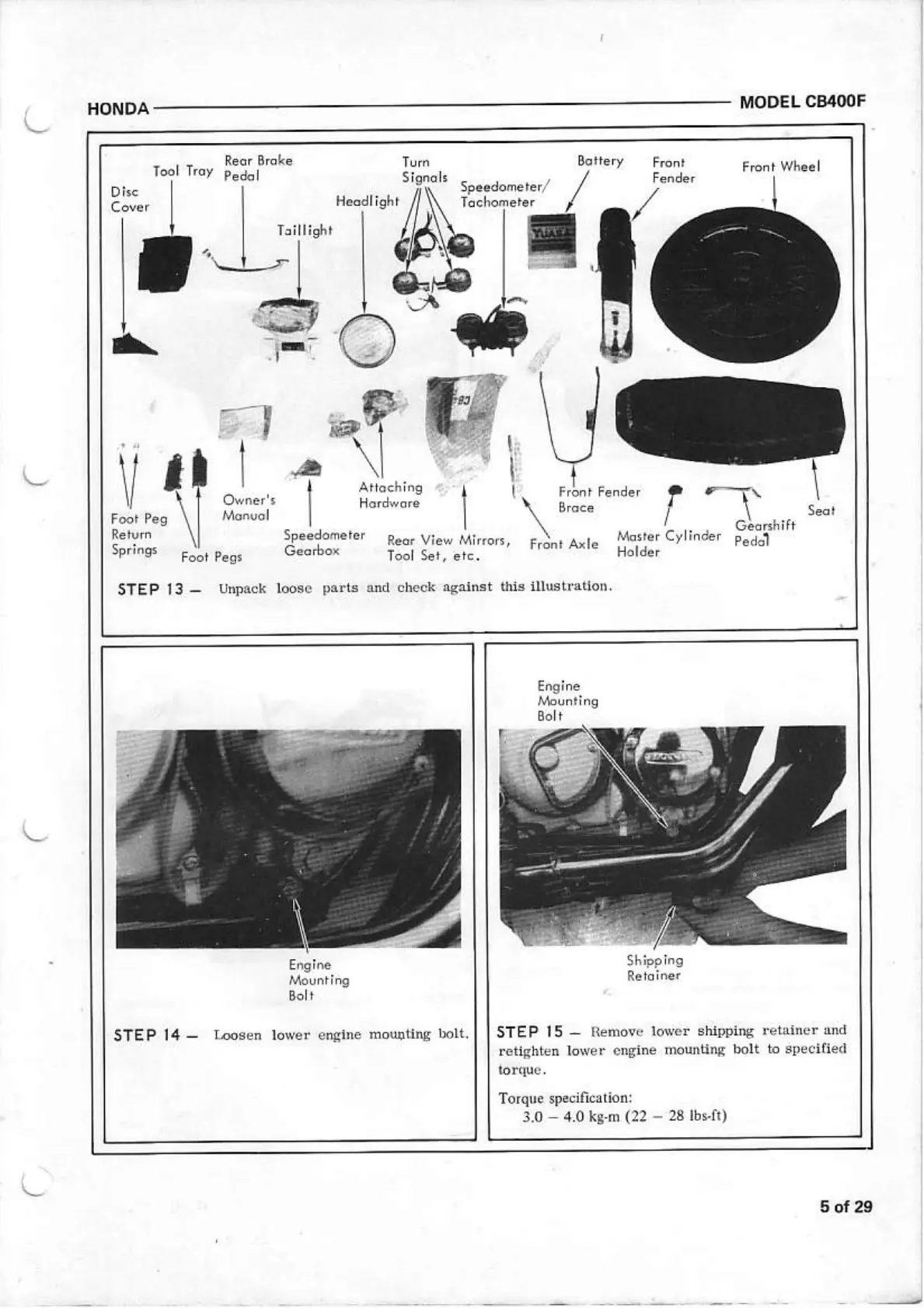 Honda CB400F - Loose Parts and Engine Mounts; Unpack and Verify Loose Parts; Engine Mounting Bolt and Retainer
