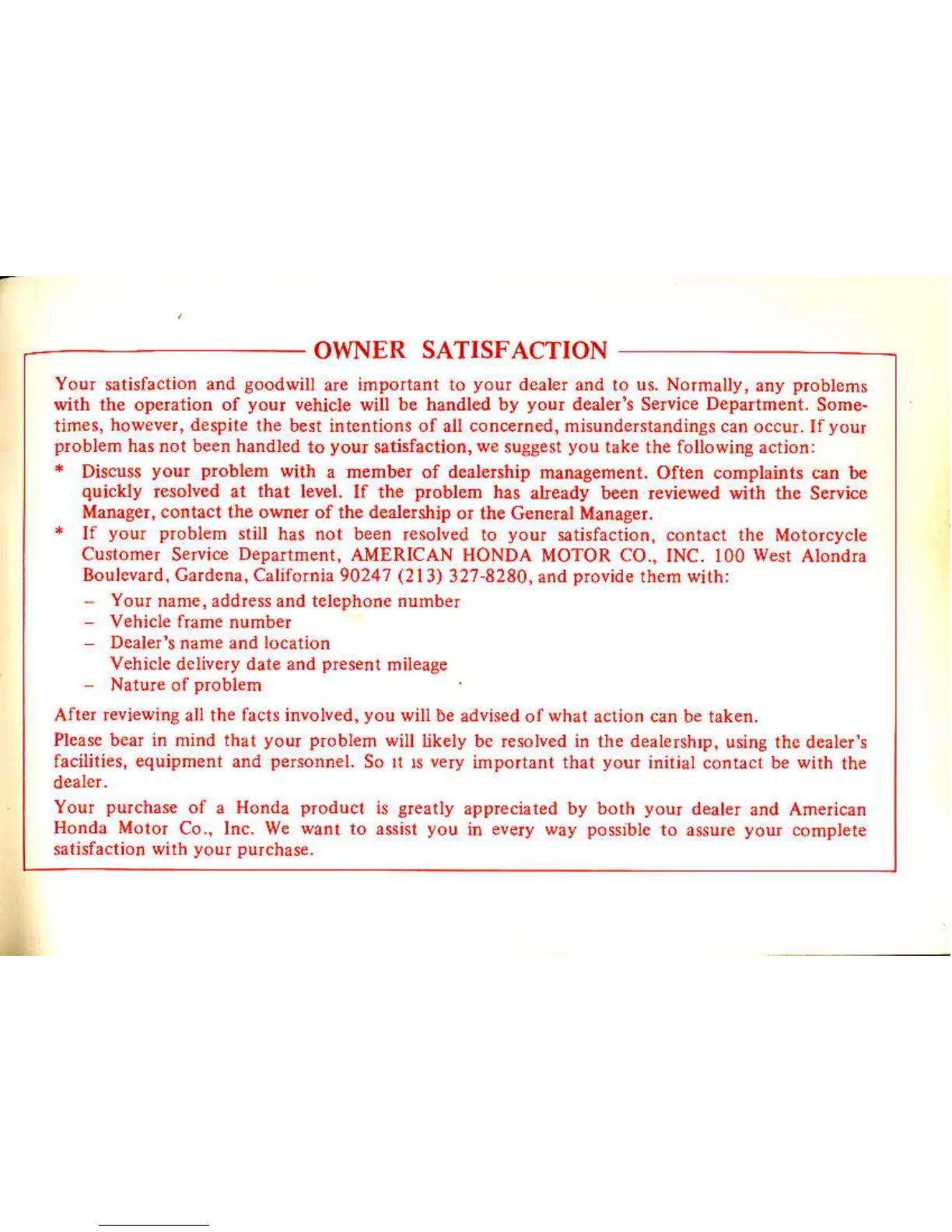 eiisfaciion, co.tact the Motorcycle