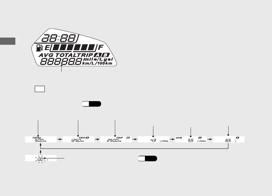 button selects the odometer, tripmeter A, tripmeter B, current fuel mileage,