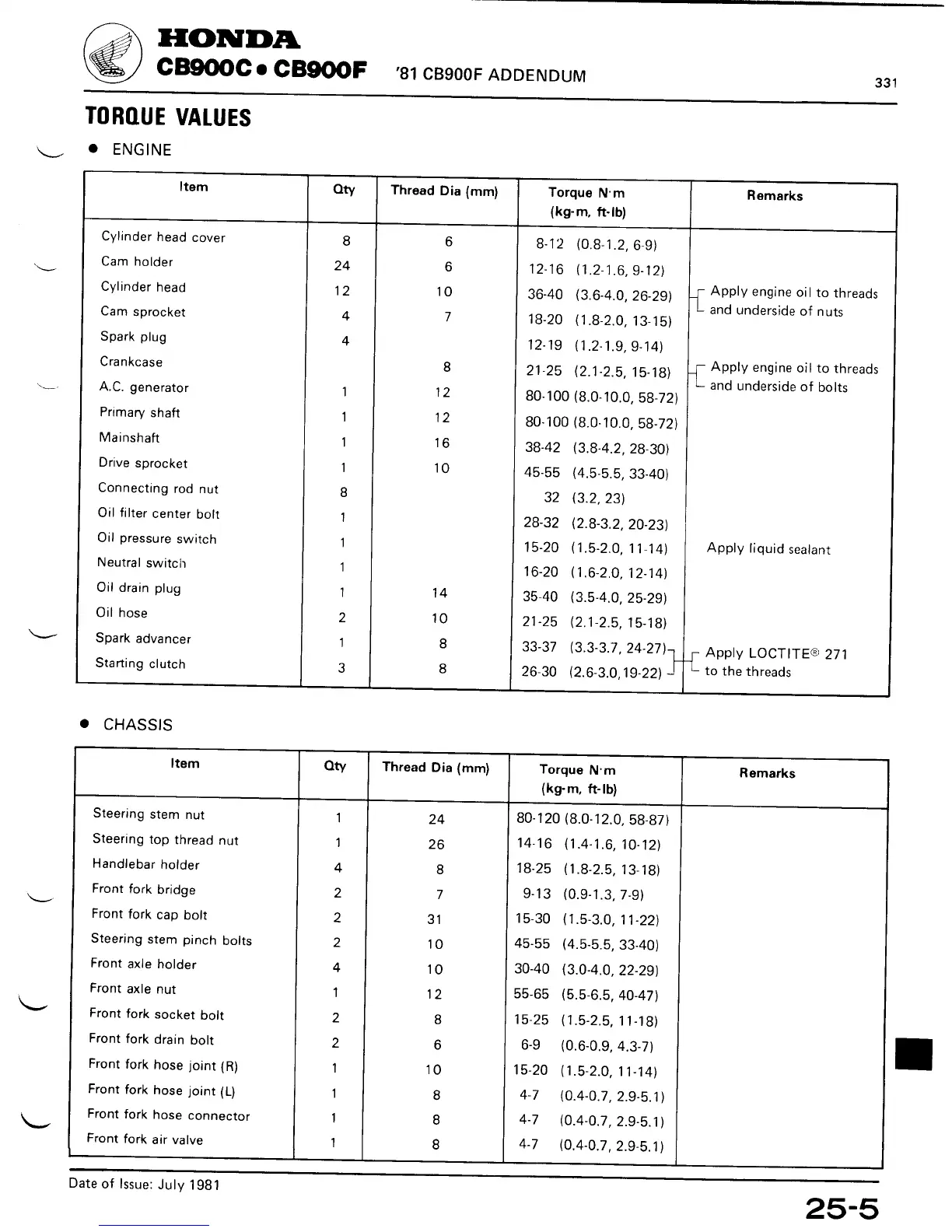 Honda CB900C - TORQUE VALUES; ENGINE TORQUE SPECIFICATIONS; CHASSIS TORQUE SPECIFICATIONS