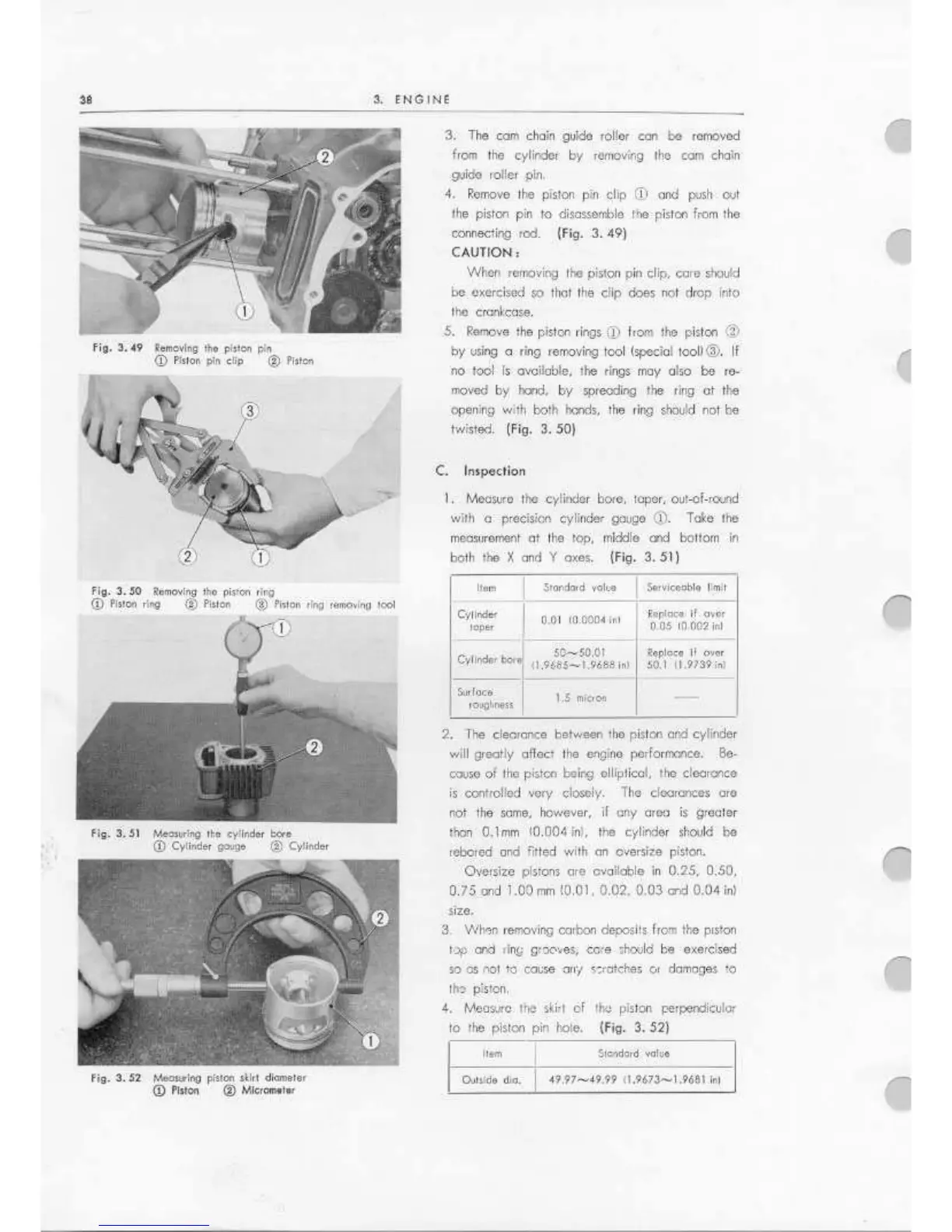 Honda CD90 - Cylinder Inspection; Removing the Piston Pin;Ring; Measuring the Cylinder Bore; Measuring Piston Skirt Diameter