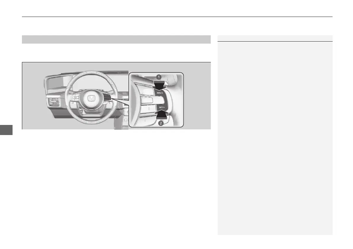 Increase or decrease the vehicle speed using the RES/+ or SET/− button on the