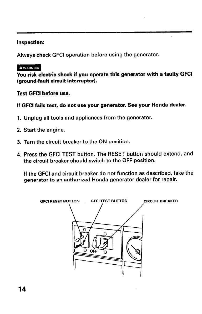 If GFCI fails test, do not use your generator. See your Honda dealer.