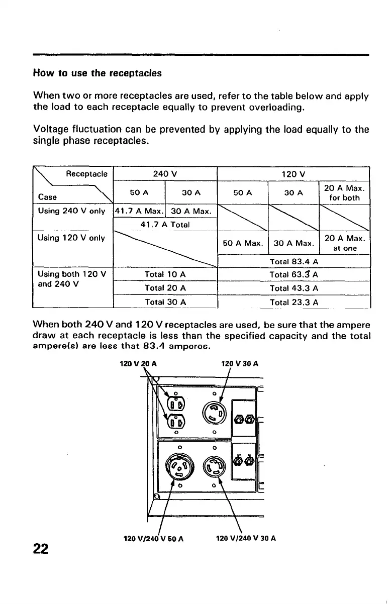 When both 240 V and 120 V receptacles are used, be sure that the ampere