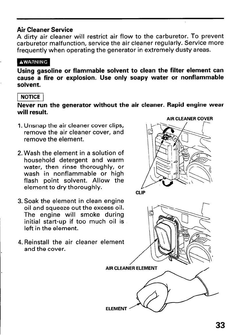Never run the generator without the air cleaner. Rapid engine wear