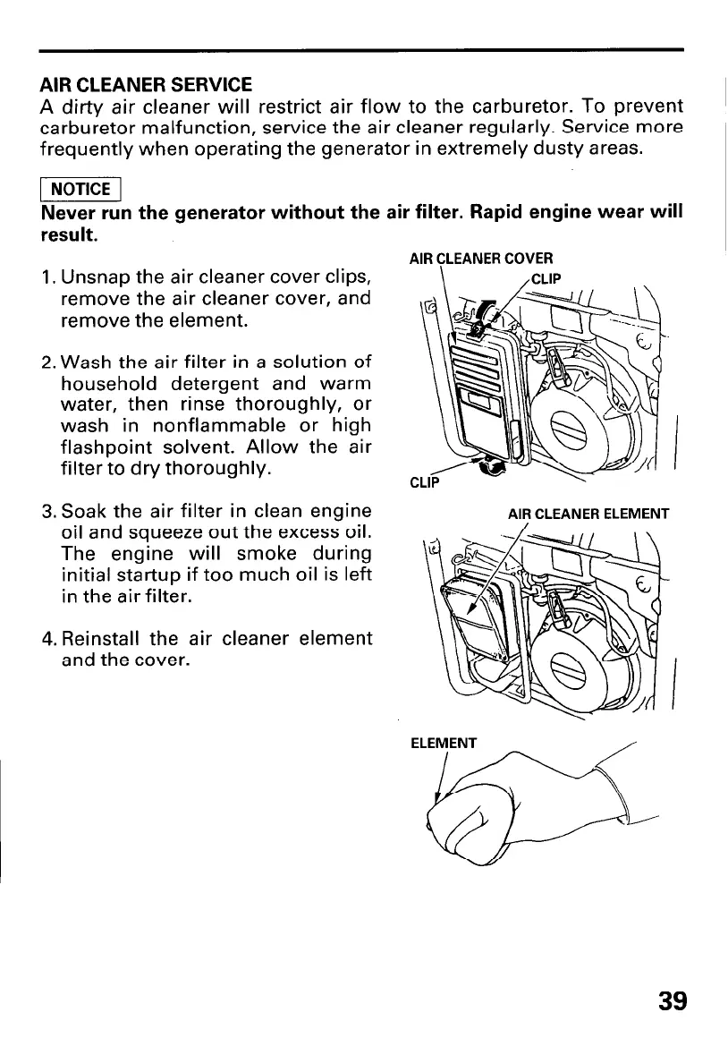 Never run the generator without the air filter. Rapid engine wear will