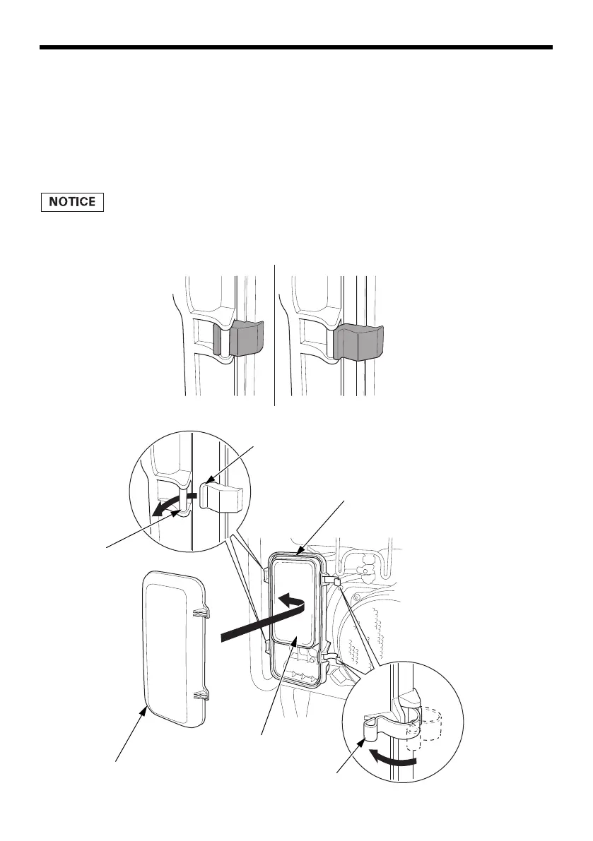 6. Set the hooks of the air cleaner cover to the setting pins securely, and then