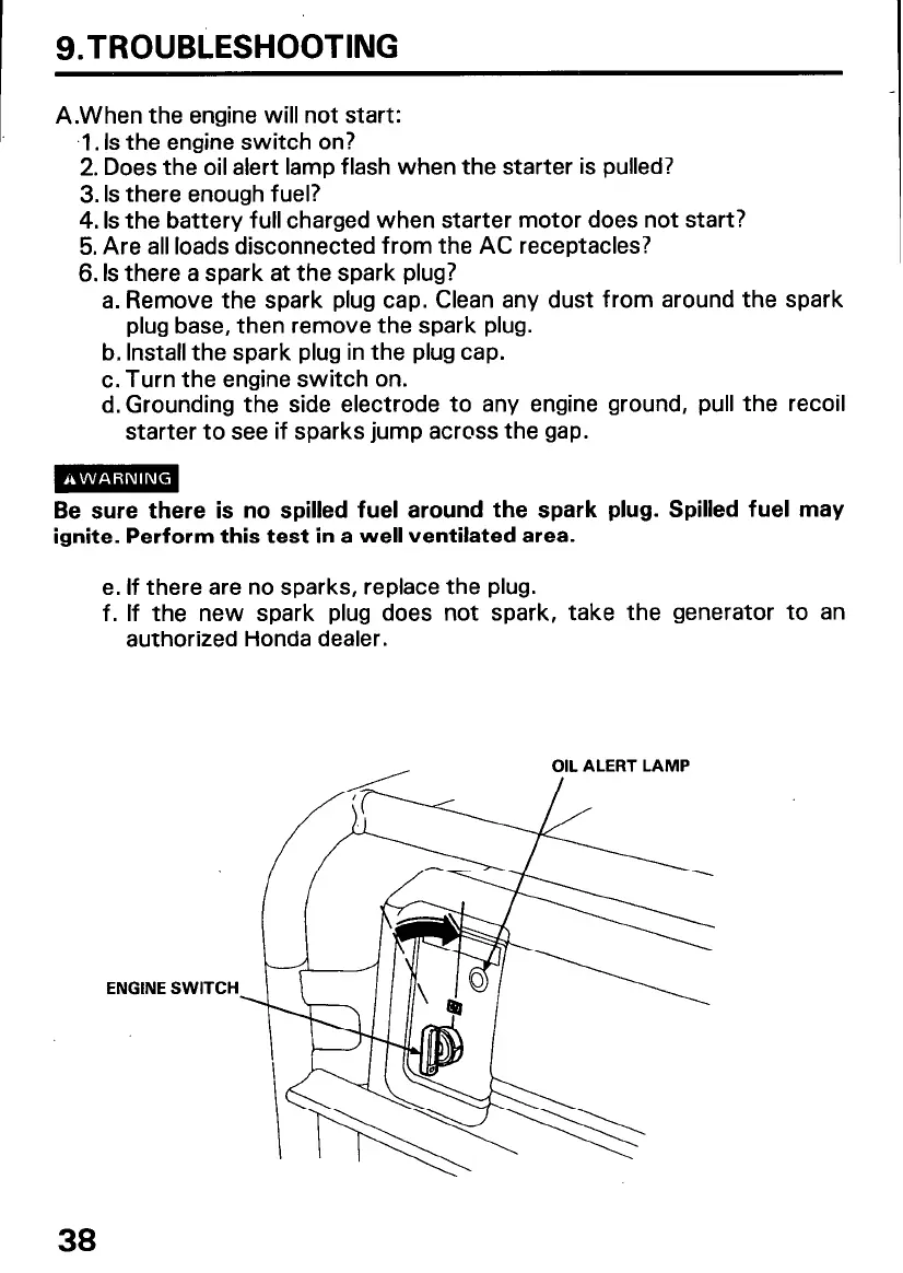 Be sure there is no spilled fuel around the spark plug. Spilled fuel may