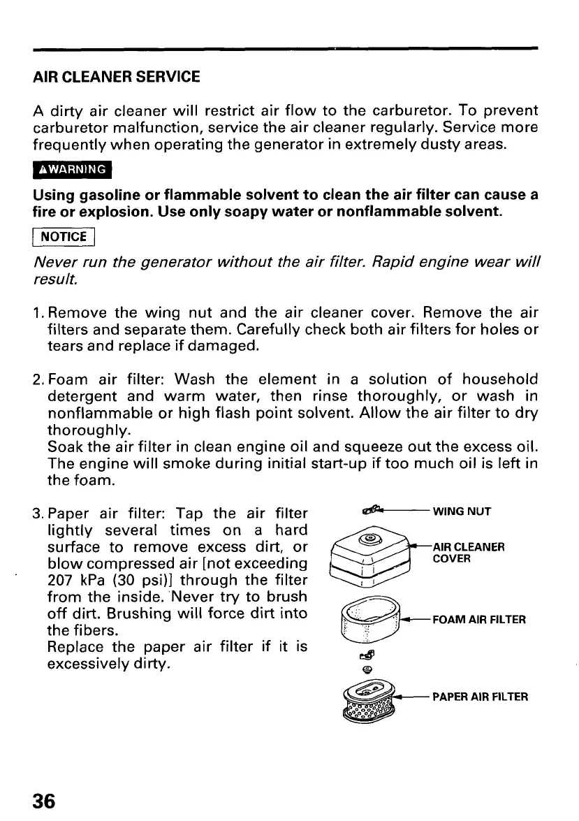 Using gasoline or flammable solvent to clean the air filter can cause a