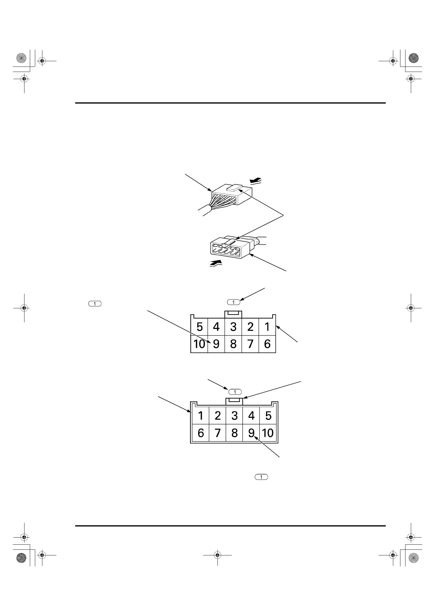 Connector drawings show the terminal arrangement, terminal No., number of pins and the shape of terminal (male or female).