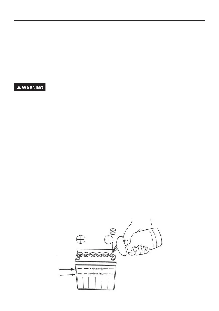 Fill the battery with distilled water to the upper level line. Never overfill the battery.