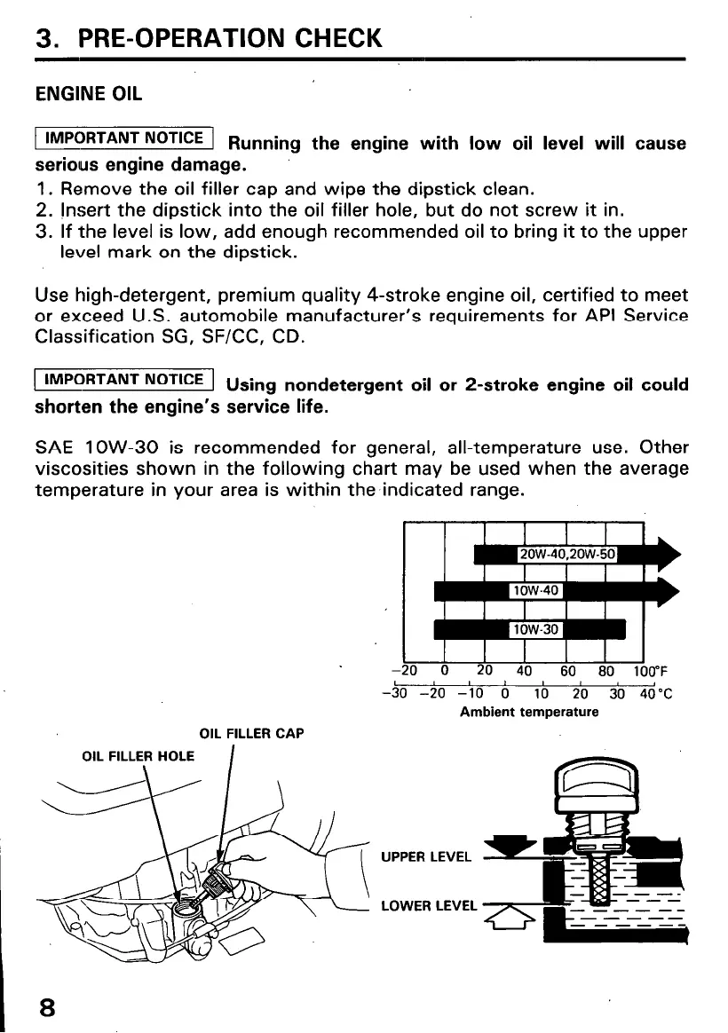 Use high-detergent, premium quality 4-stroke engine oil, certified to meet