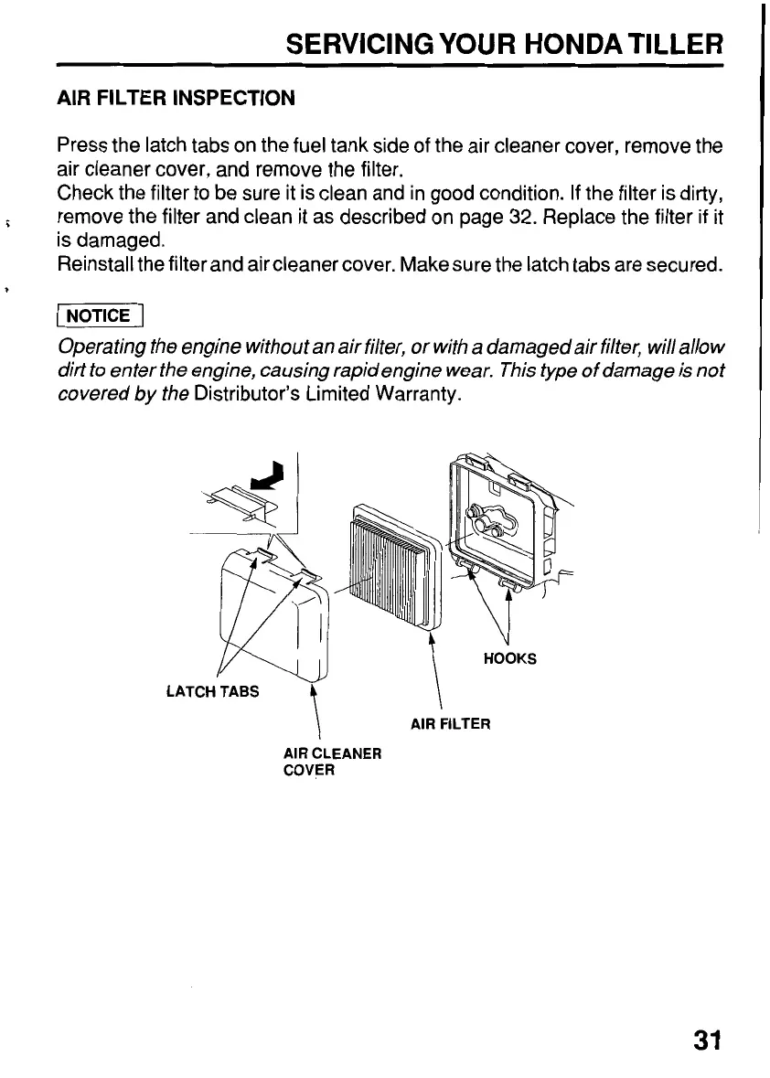 Operating the engine without an air filter, or with a damaged air filter, will allow