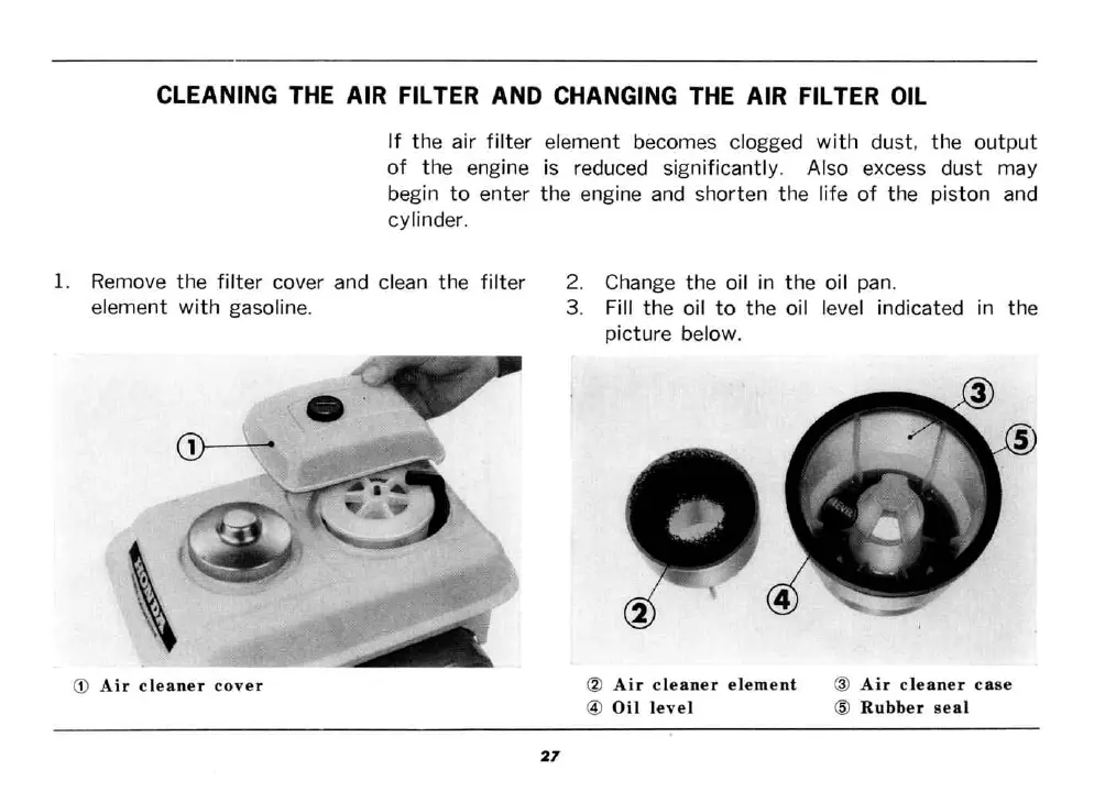 Honda F28 - CLEANING THE AIR FILTER AND CHANGING THE AIR FILTER OIL; Air Filter Element Cleaning; Air Filter Oil Change