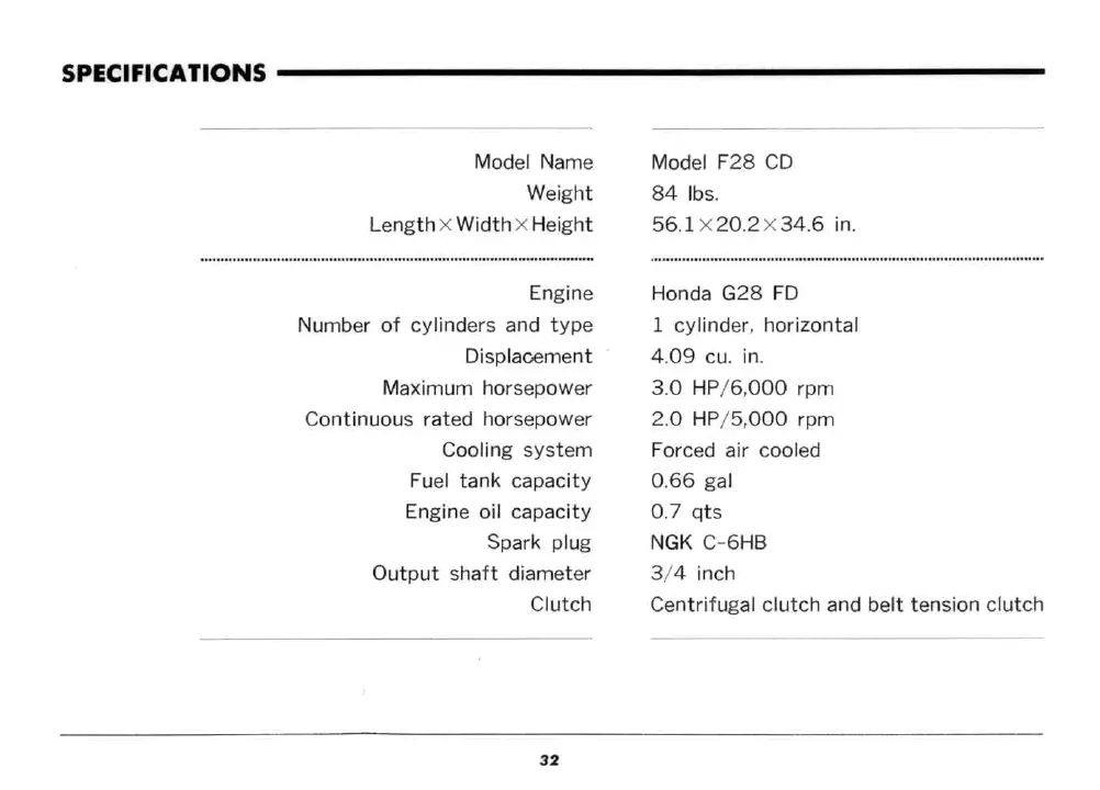 Honda F28 - Specifications