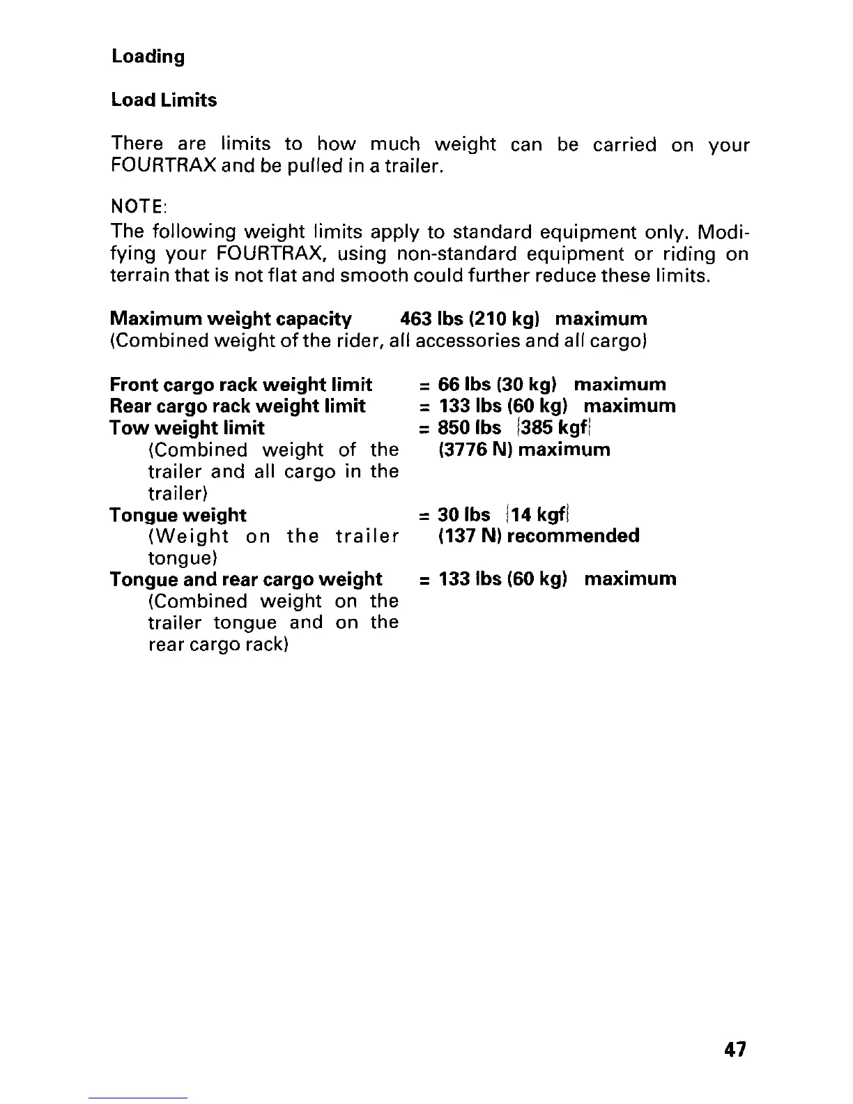 Honda Fourtrax 350 - Loading, Transport, and Accessories; Load Limits and Towing Guidelines