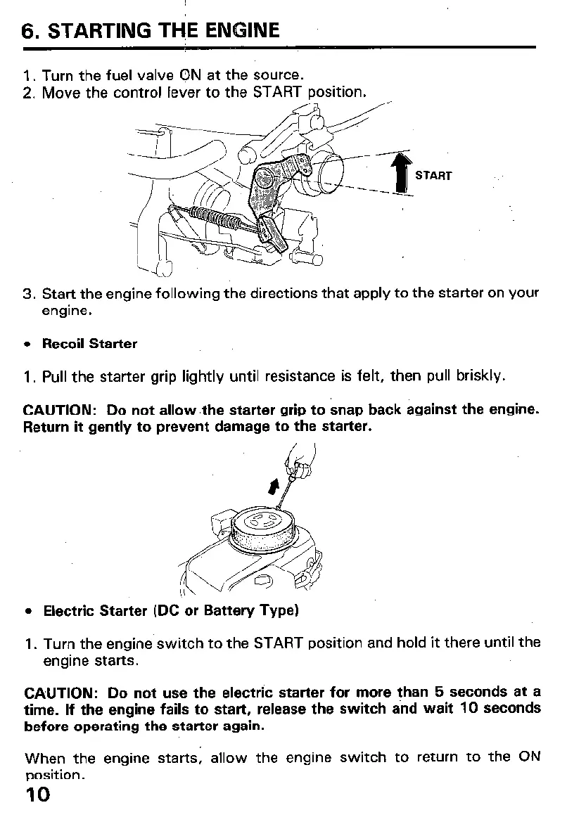 CAUTION: Do not use the electric starter for more than 5 seconds at a