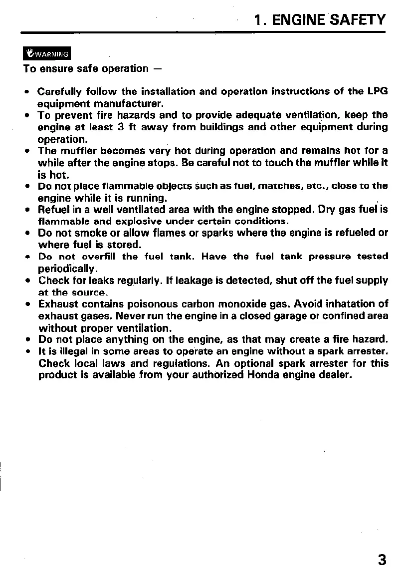 Do not smoke or allow flames or sparks where the engine is refueled or