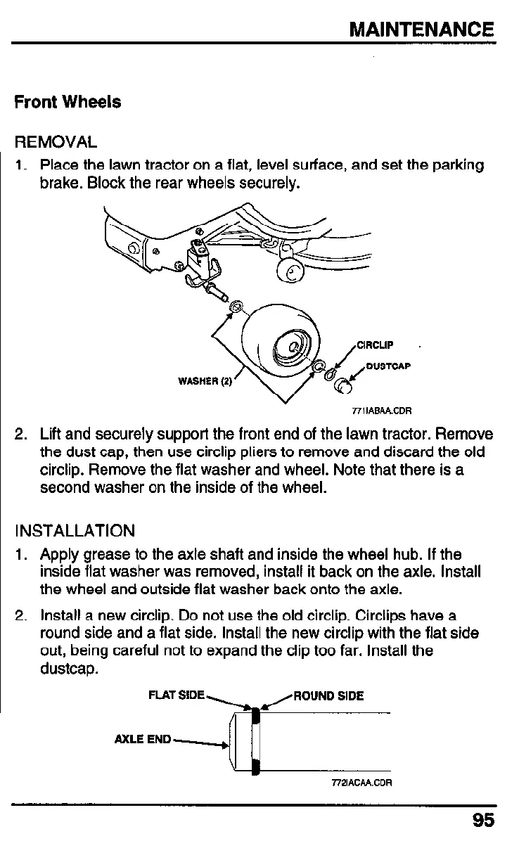 2. Lift and securely support the front end of the lawn tractor. Remove