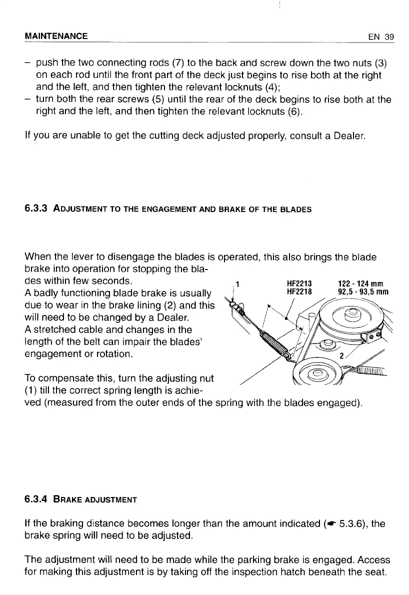 Honda HF2213 - Maintenance (cont.); Blade Engagement and Brake Adjustment