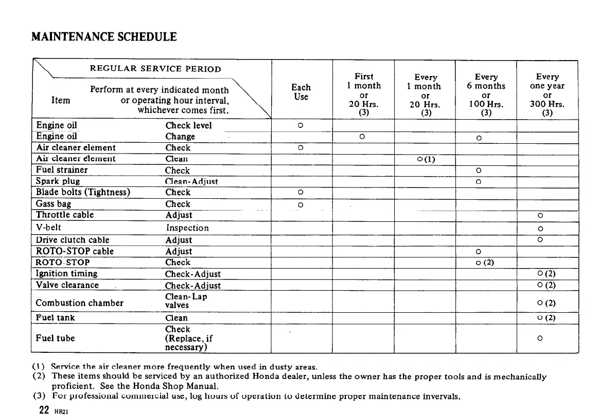 (2) These items should be serviced by an authorized Honda dealer, unless the owner has the proper tools and is mechanically