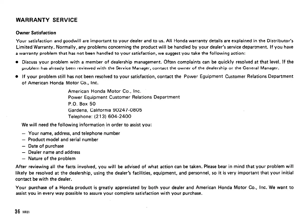 Your purchase of a Honda product is greatly appreciated by both your dealer and American Honda Motor Co., Inc. We want to